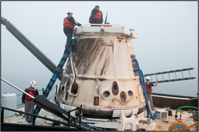 舞台は宇宙から海上へ?はたまた、ここは造船所?いいえ、これは僕とサニータによるロボットアーム操作で、宇宙ステーション(ISS)から取り外し、離脱させ、無事、太平洋上に着水したドラゴン補給船のカプセルです。中には約334kgの宇宙実験の成果と、約229kgのISS関連機器を回収して、はるか高度400キロから地球に戻ってきたんです。宇宙飛行士自ら、カラダを張った医学実験のサンプルも入っているんです。大事に開封してね。