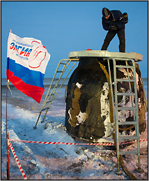 1月下旬は日本で最も寒い時期、大寒ですね。皆さんのお住まいの地域では雪景色が見られましたか?広々とした雪の平野にそびえたつこのカプセル、これは日本ではなく、カザフスタンの雪原に着陸したソユーズ宇宙船のカプセル。既に中は空っぽ、そう、このカプセルに入って、サニー、ユーリ、僕の3人は宇宙ステーションから地球に帰還し、無事に引っ張り出された後なんです。古めかしいカプセルに見えるって?でも、ソユーズ宇宙船の帰還カプセル、素晴らしい実績、信頼性・・・、そして何よりユーリ船長の操縦によって、無事に地球に着陸できた記念の地点です。
