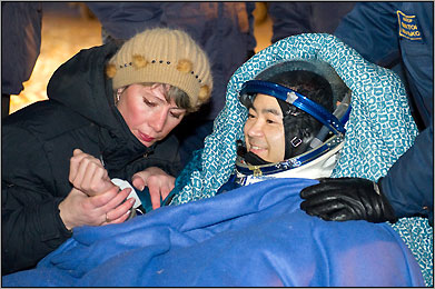 まだ太陽が昇る前の薄明かりの中、僕は椅子に座っています。浮き上がっていない!そう、当たり前だけど、これが重力!僕ら3人を乗せたソユーズカプセルは無事、カザフスタンの雪原に着陸。カプセルから引っ張りだしてくれた皆さん、そして取材に来てくれた皆さん、寒い中、ありがとう。サニー、ユーリ、そしてこんなに多くの皆さん、全てに感謝!
