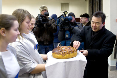 ロシアって国が伝統やゲン担ぎが大好きなことはこれまでも紹介してきたけど、このシーンもその一こま。ソユーズ宇宙船で無事帰還した宇宙飛行士(=ゲスト)に対し、敬意と歓迎の意味を込め、星の街(Star City)の学校の女の子 たちが“karavai”と呼ばれるロシアの伝統的なパイ(パン?)と“塩”で、もてなしてくれるんです。美味しそう!どれどれ、まずは一口。えっと、お味は???