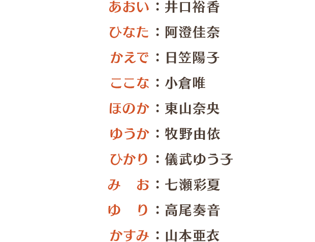 あおい:井口裕香、ひなた:阿澄佳奈、かえで:日笠陽子、ここな:小倉唯、ほのか:東山奈央、ゆうか:牧野由依、ひかり:儀武ゆう子、みお:七瀬彩夏、ゆり:高尾奏音、かすみ:山本亜衣
