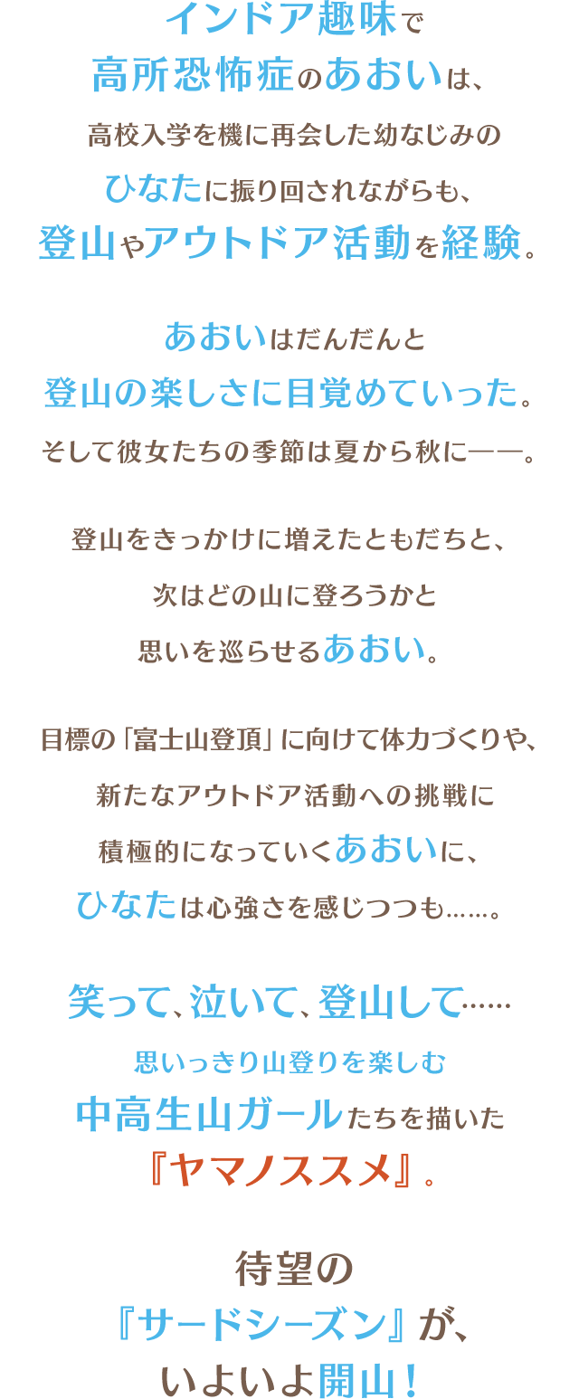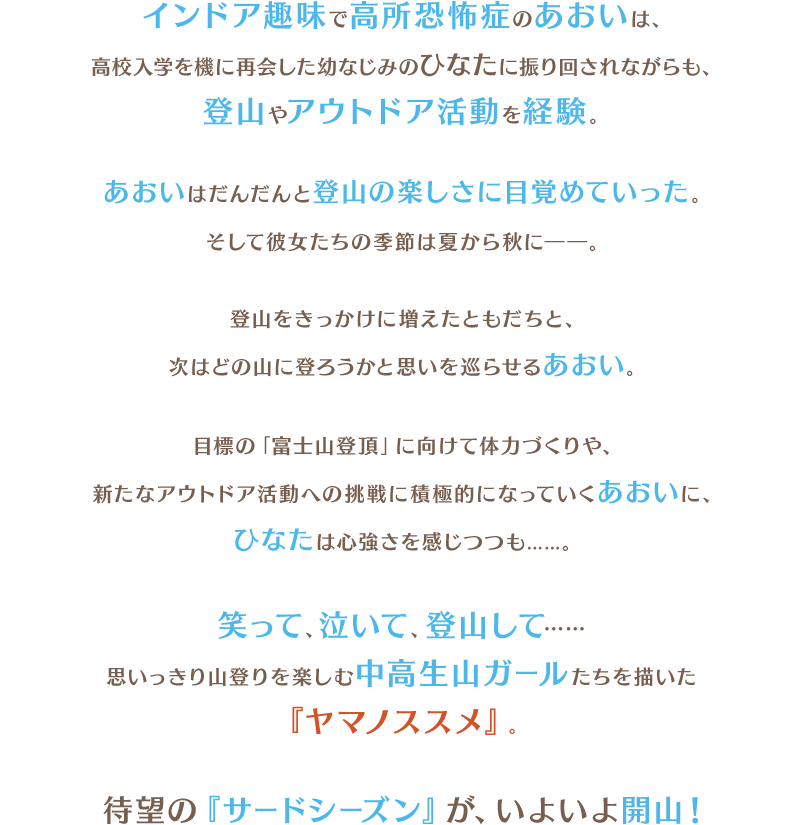 インドア趣味で高所恐怖症のあおいは、高校入学を機に再会した幼なじみのひなたに振り回されながらも、登山やアウトドア活動を経験。あおいはだんだんと登山の楽しさに目覚めていった。そして彼女たちの季節は夏から秋に――。登山をきっかけに増えたともだちと、次はどの山に登ろうかと思いを巡らせるあおい。目標の「富士山登頂」に向けて体力づくりや、新たなアウトドア活動への挑戦に積極的になっていくあおいに、ひなたは心強さを感じつつも……。笑って、泣いて、登山して……思いっきり山登りを楽しむ中高生山ガールたちを描いた『ヤマノススメ』。待望の『サードシーズン』が、いよいよ開山! インドア趣味で高所恐怖症のあおいは、高校入学を機に再会した幼なじみのひなたに振り回されながらも、登山やアウトドア活動を経験。あおいはだんだんと登山の楽しさに目覚めていった。そして彼女たちの季節は夏から秋に――。登山をきっかけに増えたともだちと、次はどの山に登ろうかと思いを巡らせるあおい。目標の「富士山登頂」に向けて体力づくりや、新たなアウトドア活動への挑戦に積極的になっていくあおいに、ひなたは心強さを感じつつも……。笑って、泣いて、登山して……思いっきり山登りを楽しむ中高生山ガールたちを描いた『ヤマノススメ』。待望の『サードシーズン』が、いよいよ開山!