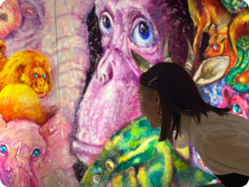 神戸展では、全長26mの圧巻の代表作「Animal History」はもちろんのこと、色彩に埋もれる没入空間、神戸展のために石村嘉成が新たなテーマに挑戦した異色の新作など200点を超える作品を展示。