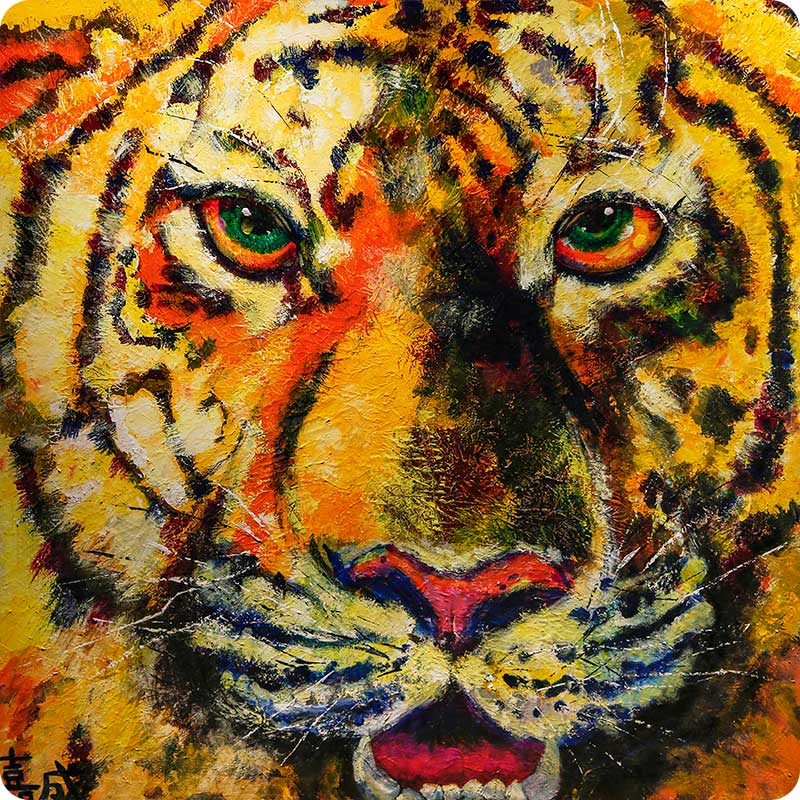 現在はアクリル画をメインに、動物から昆虫、花まで、“いのち”の輝きを描き続ける。