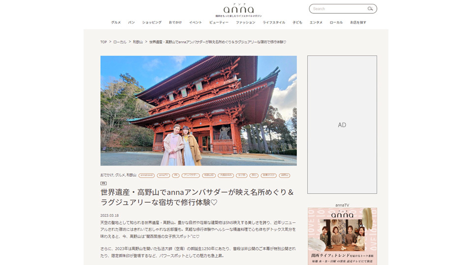 高野山・那智勝浦・白浜の3エリアを地上波番組「anna」で放送。