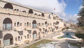カッパドキアで初めて岩を掘って建てられた洞窟風ホテル。朝食会場からは眼下に広がる寄岩群が見渡せ、気球が飛んでいる様子が見えるかも!?