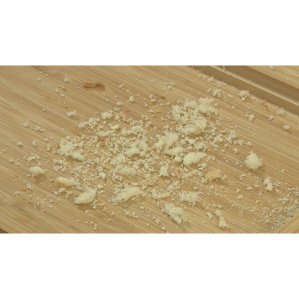 - パン好きにぴったりのまな板。サンドイッチをカットしたときにパンくずがテーブルの上に散らばらない。