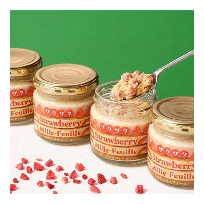 - 苺のミルフィーユをイメージしたザクザク食感のビスケットと甘酸っぱい苺の味が楽しめるスプレッドです。トーストやアイスのおともに。