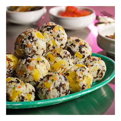 - チュモッパとは韓国伝統の家庭料理で、漬物や野菜、韓国のりなどの具材を混ぜ合わせ食べやすく一口サイズに丸めたおにぎりです。韓国のりの風味と酸味が特徴で、漬物の食感がアクセントで日本人好みの味わいです。