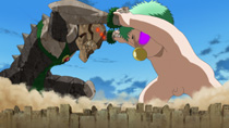 男鹿たちは、アランドロンの娘・アンジェリカが幽閉されているというヴラドの盗賊街へとやってきた。盗賊の頭目は、自分たちの仕事をやりやすくするため、「次元転送悪魔」であるアンジェリカの力を利用しようとしていたのだ。だがアンジェリカはそれを断固として拒否。そのため、彼女は牢に囚われているという。そこへアンジェリカを助けるべく、気合満々の古市、そして男鹿たちが現れる。古市に「逃げてください!」と言うアンジェリカ。アンジェリカによれば、「ヴラドの主」が魔境を荒らしすぎた盗賊たちに怒り、街に向かっていて、非常に危険だという。そしてその言葉通り、街に巨大な魔獣が現れる。驚く住人たち。この緊急事態にもかかわらず、逃げようとした古市の頭が牢の鉄格子にはまり込んで抜けなくなった!?必死で助けようとする男鹿たちだが、古市の頭はなかなか抜けず、その間に男鹿たちは盗賊団に囲まれてしまう。大ピンチ!その時、魔界に来てからというもの、これまでになく元気いっぱいだったベル坊のからだに異変が起こり始める!!