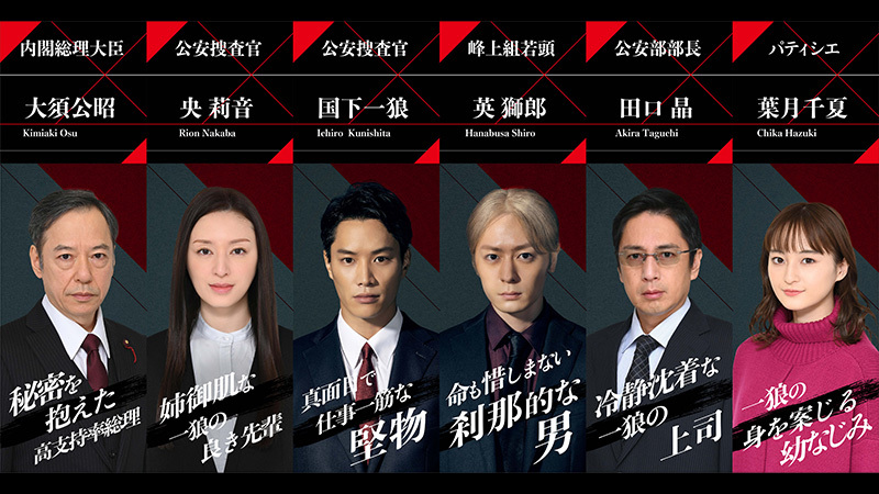 さらに、メインキャスト6名が揃ったキャラクタービジュアルも解禁!公開されたのは、公安捜査官・一狼、ヤクザの若頭・獅郎(犬飼貴丈)、一狼の先輩公安捜査官・莉音(栗山千明)、公安部長・田口(徳井義実)、総理大臣・大須(板尾創路)、一狼の幼馴染・千夏(萩原みのり)の6名が並ぶビジュアル。一狼と獅郎の秘密捜査が、公安上層部、さらには総理大臣までをも巻き込み、物語が大きなスケールで展開する事が予感される。